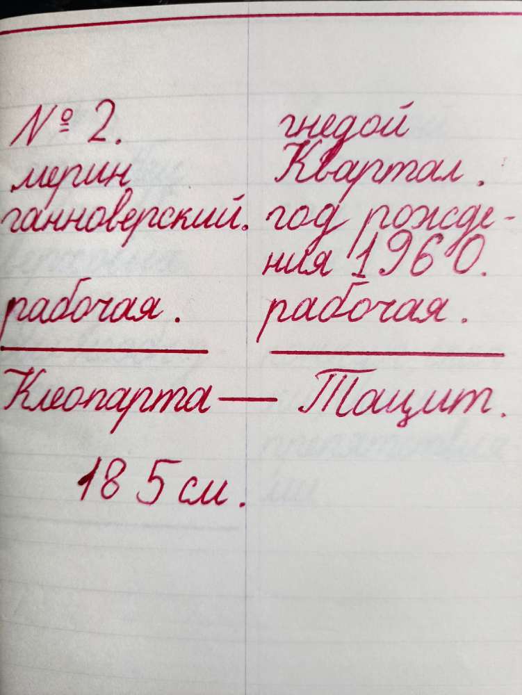 «Бабочка. Рыжая Бабочка рожд. в 1950 г. Бабочка самая старая лошадь, но она очень резвая. Я ездила на ней 9 раз. Галопом она не ходит, но рысь у неё замечательная. Все ребята называют её просто «бабушкой». Очень милая лошадь!